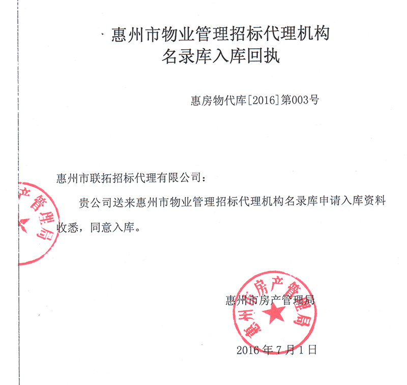 招標代理機構房產入庫回執